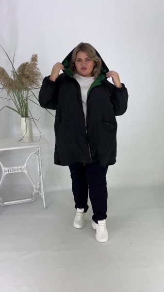 Комфортна вітрівка-куртка, зшита з плащової тканини Канада. Тканина має гарну якість, водонепроникна та вітронепроникна, що забезпечує надійний захист у негоду. Модель має вільний, об'ємний крій (оверсайз), що забезпечує комфортну посадку та м'яко приховує недоліки фігури. Підкладка виконана на флісі, що забезпечує додаткове тепло.