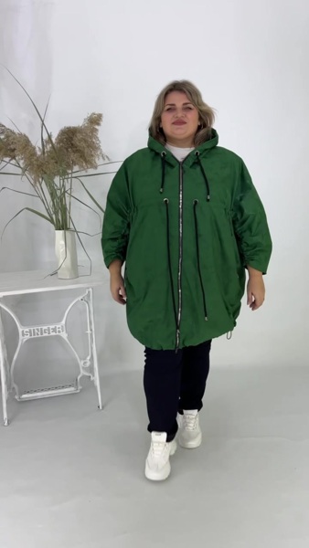 Затишна елегантна вітрівка-куртка, зшита з плащової тканини дуже гарної якості. Тканина водонепроникна та вітронепроникна, що забезпечує надійний захист у негоду. Модель має вільний, об'ємний крій (пончо/оверсайз), що забезпечує комфортну посадку та м'яко приховує недоліки фігури. Куртка оснащена глибоким капюшоном.