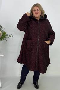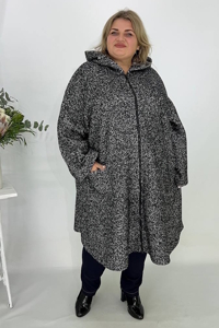 Пальто має великий капюшон. Застібається на довгу центральну блискавку чорного кольору. З боків розташовані великі накладні кишені. Рукави широкі, вільного крою. Виріб виглядає теплим і комфортним, підходить для прохолодної погоди. Його вільний крій та капюшон створюють затишний і практичний образ.